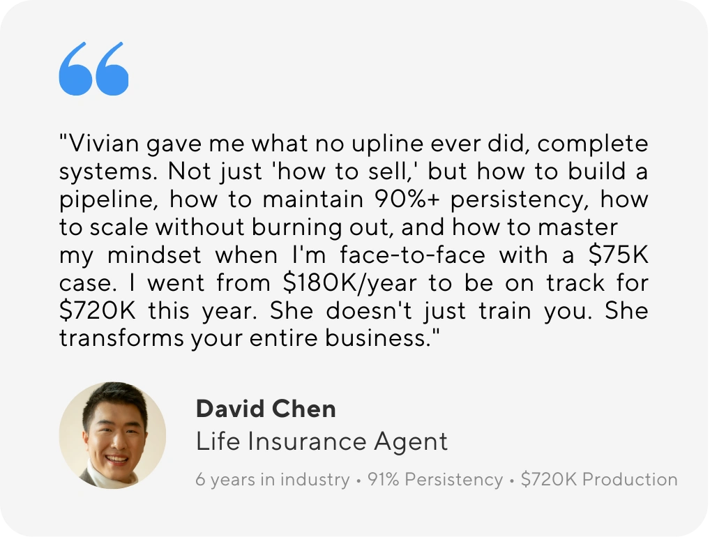 I did exactly that. Now I help elite insurance agents earning $100K+ scale to $50K-$100K monthswithout switching uplines, without burning out, without losing their integrity.